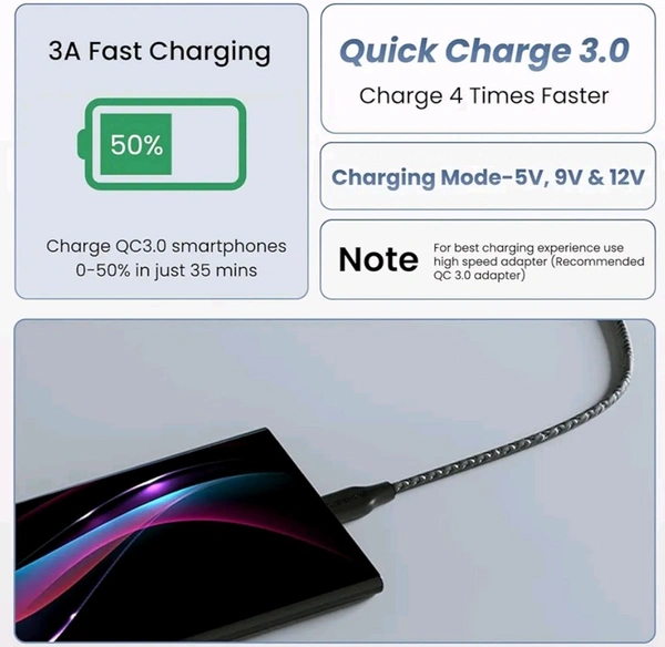- Fast Charging & Quick Charge 3.0: Equipped with 3A power output and Quick Charge 3.0 technology, this cable ensures your devices are charged rapidly and efficiently.